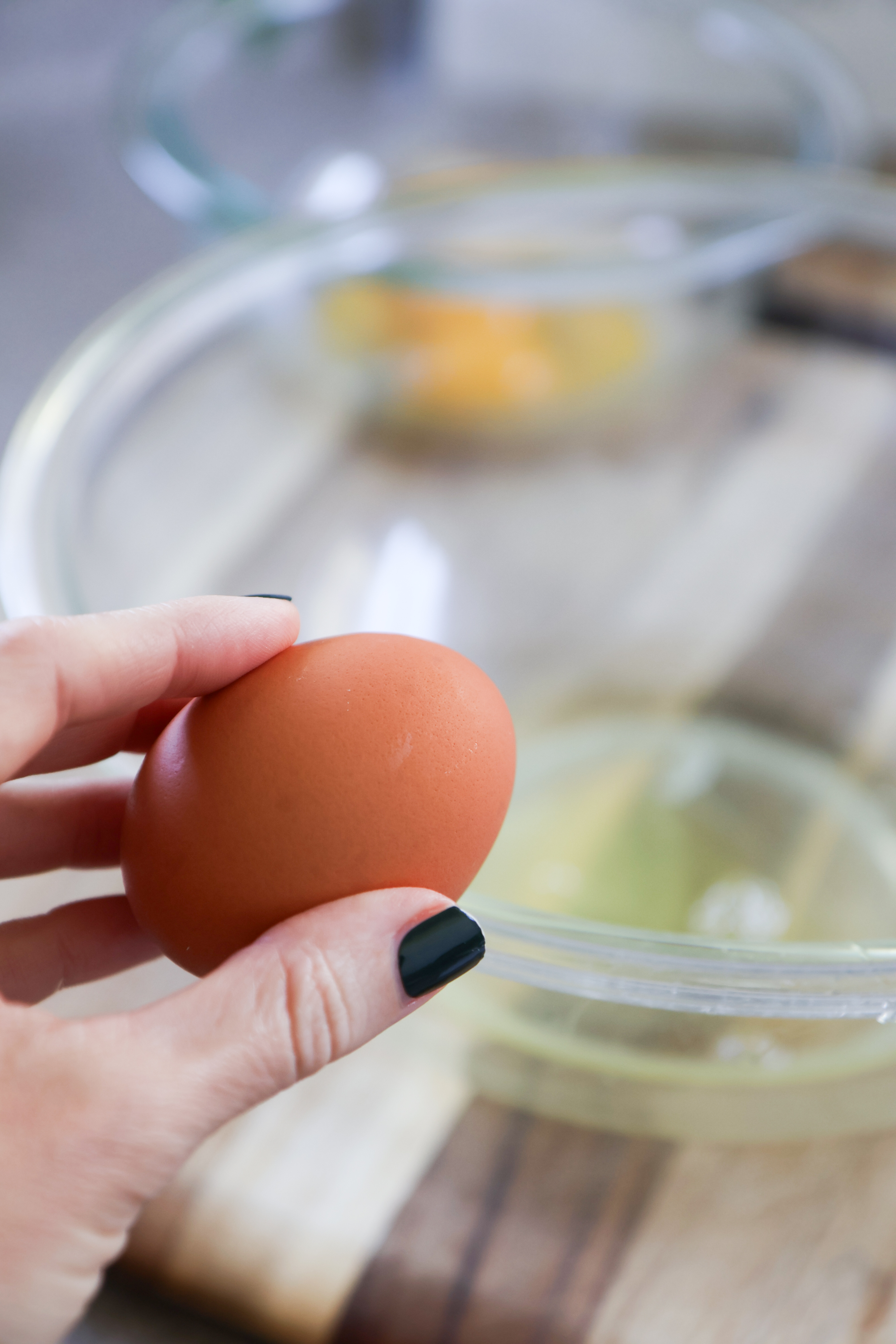 - Place 5 egg whites and white sugar in a medium sized bowl and mix with an electric mixer for 5 – 7 minutes until thick and doubled in volume.