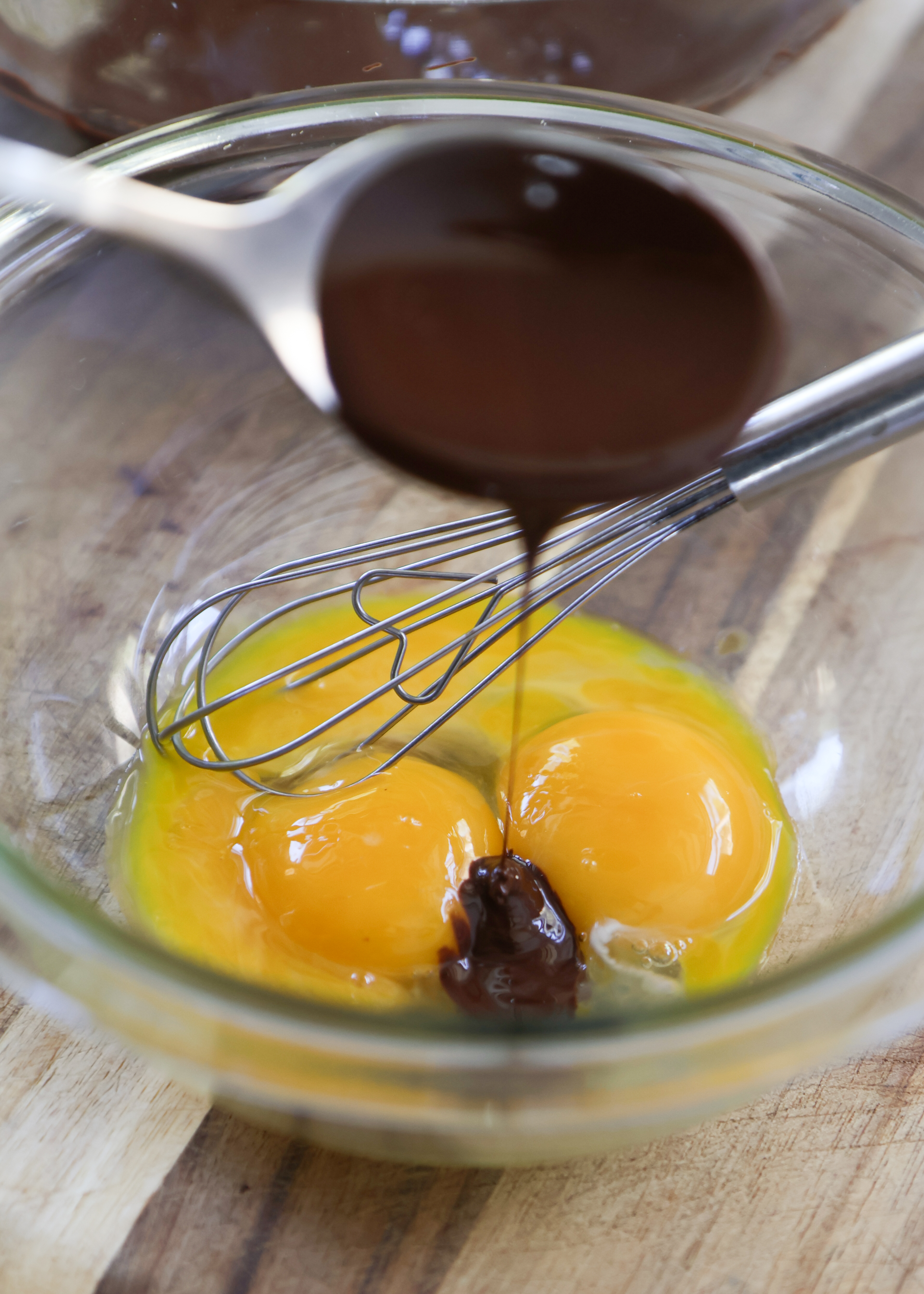 - Separately, whisk together 3 egg yolks in a small bowl. Add a bit of the melted chocolate to temper the egg yolks. Mix well. Set aside.