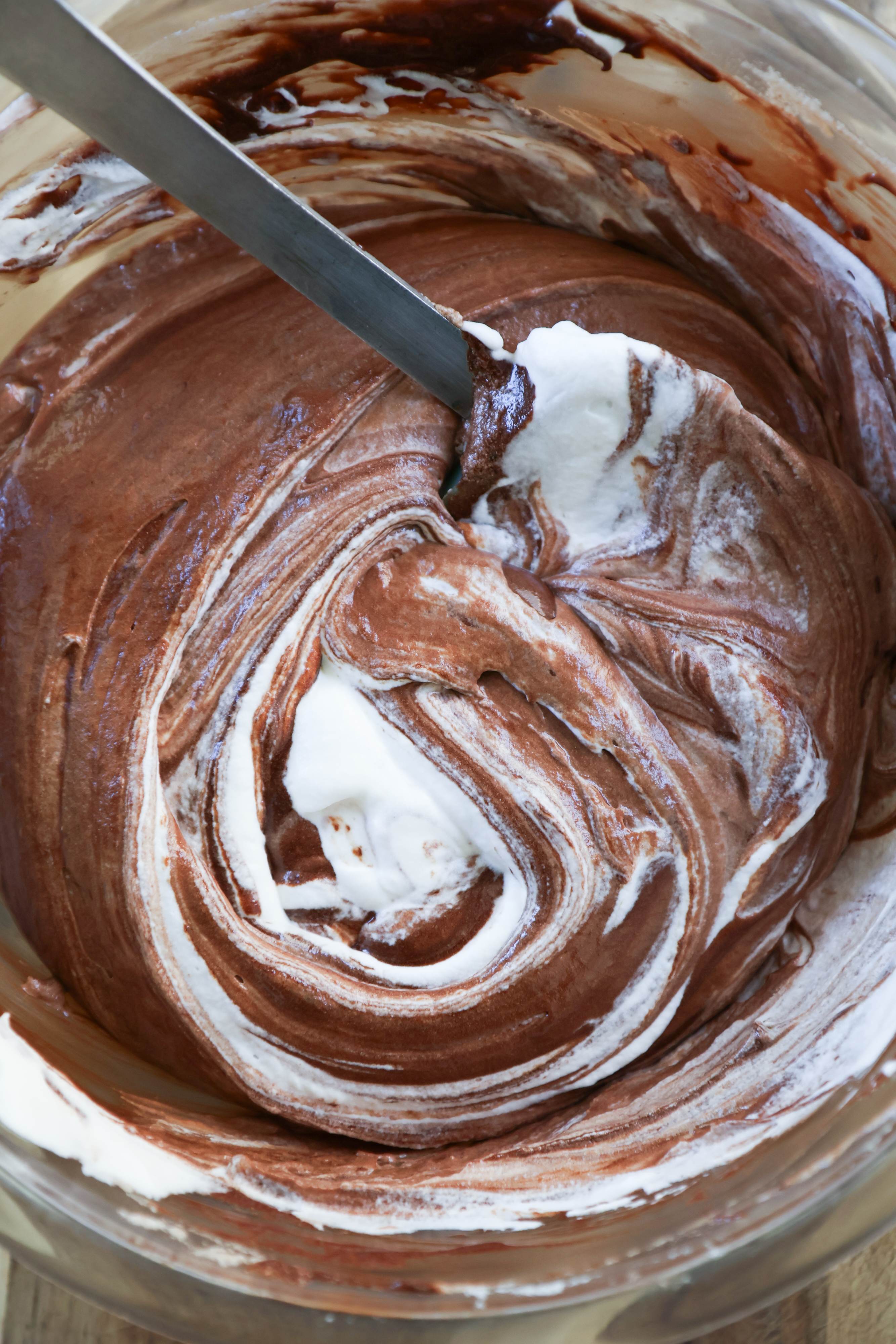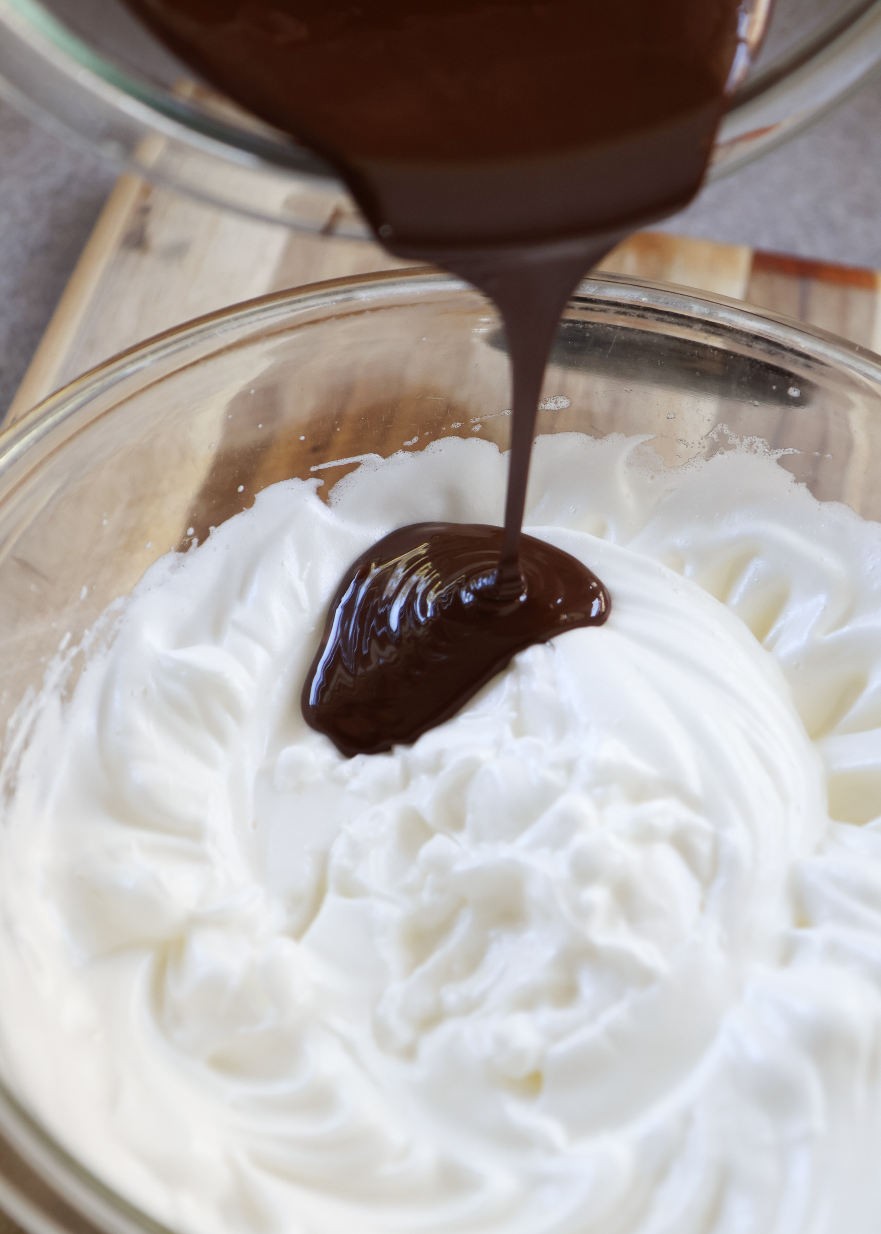 - Using a spatula, fold egg yolk / chocolate mixture into whipped egg whites until combined. Next fold in the melted chocolate ( I usually do this in three batches), being careful in the folding. You want to keep as much air in the mixture as possible.